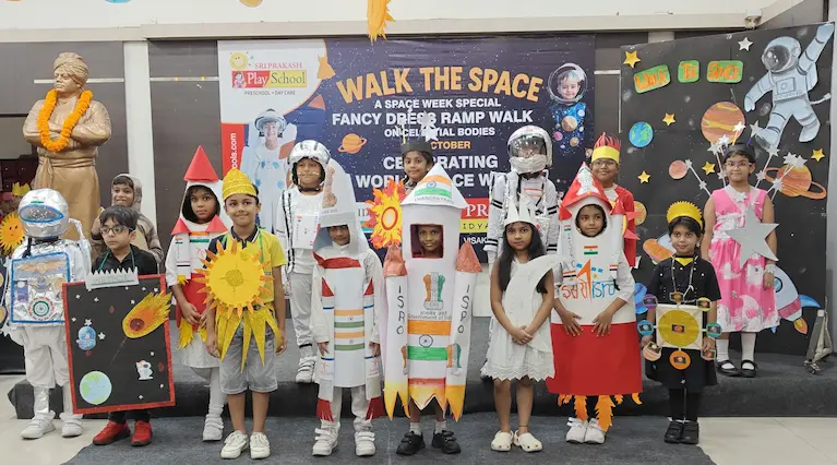 On 8th October 2025, Sri Prakash Vidyaniketan, TPT Colony, celebrated World Space Week with a dazzling event titled “Walk the Space – A Fancy Dress Ramp Walk on Celestial Bodies.”